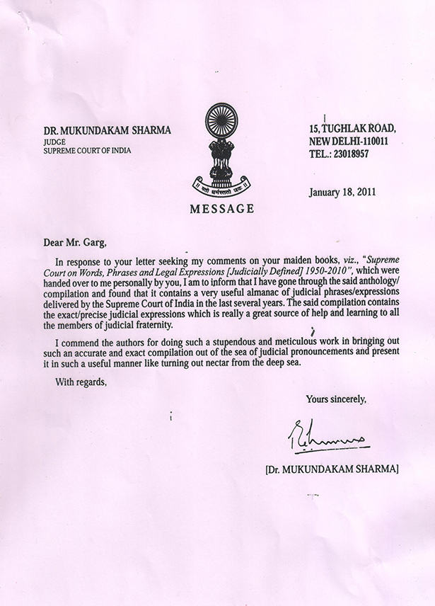 T.L. Garg and Rohan Garg have authored a three-volume book titled ‘Supreme Court on Words, Phrases and Legal Expressions (1950-2015)’ which has been published by Thompson Reuters. This compilation contains over 75 thousand words, phrases and legal expressions as defined by the Supreme Court. The compilation has received testimonials from 9 sitting judges of the Supreme Court of India.